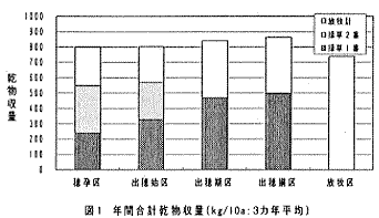 ほど1番草の収量は増加したが、出穂揃区は出穂期区に比べ収量の差は小さく(図1)、
