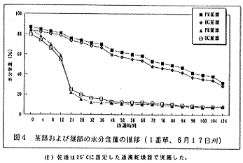 た(図3)。両草種とも、茎部の乾燥速度は葉部に比べて著しく遅く(図4)、