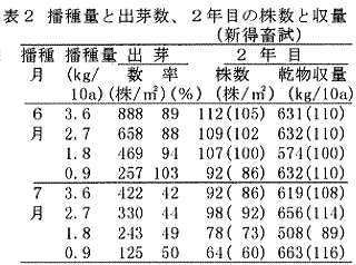 - 播種は7月までに終えること。播種量は単播では1.8kg/10aを中心として、7月播