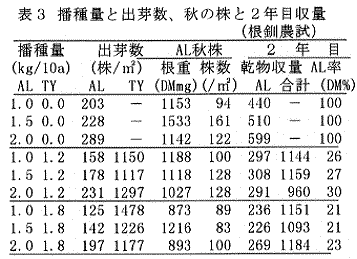 ルファルファ1.5kg/10a、チモシー1.2kg/10a程度とする。(表2、3)