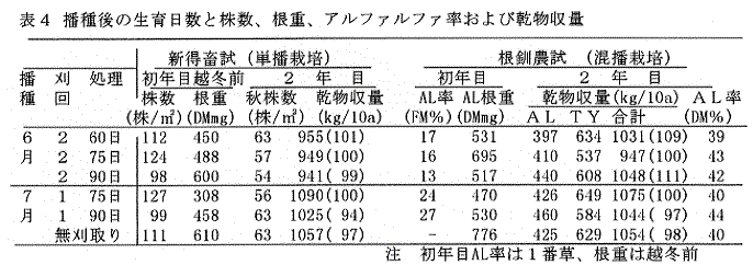 ァルファの定着・スタンドの確保にむけて、天北では雑草対策について、新得では単播