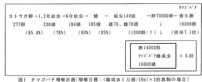 - ヨトウガ卵を餌として、タマゴバチ雌成虫50000頭を得るための増殖計画を作成した