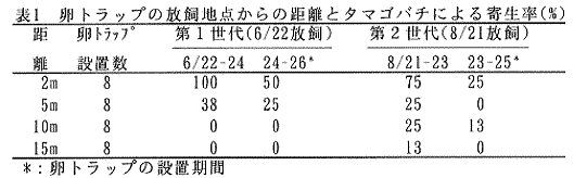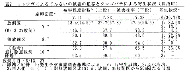 トウガ卵の被寄生率を高め、てんさいの被害を軽減することが可能である(表2)。