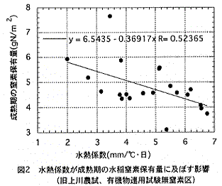 - 成熟期の水稲窒素保有量は、前年秋9/1〜10/31および当年春4/11〜5/10の水熱係数