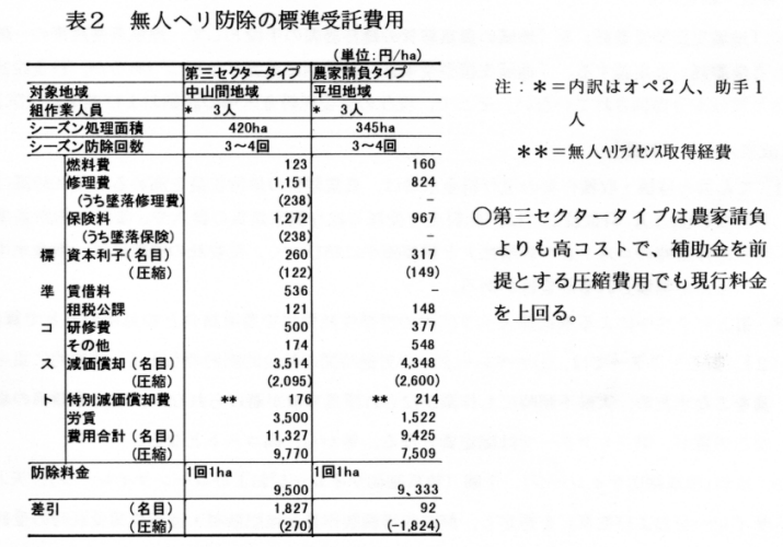 第三セクターによる水稲無人ヘリ防除の標準受託費用を農家請負との対比のもとで算出すると(表2)、第三セクターでは、1.オペレーターの労働時間の社会的制約のもとで、時期的に集中する委託作業をこなすため、天候不順時にも作業がなされ墜落事故が避けられない、2.農家請負の場合変動費となる労賃が、第三セクターでは固定費となる、等から、高コストとなる。