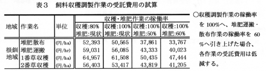 根釧(牧草細切サイレージ)、十勝(牧草細切サイレージおよびコーンサイレージ)、天北(牧草細切サイレージおよび乾草)を想定し、飼料収穫調製作業と堆肥散布・運搬作業受託時の受託費用を試算すると(表3)、現状では、堆肥散布・運搬作業等周辺作業の稼働率はおよそ50%以下であるが、これらの稼働率をあげることで、単位面積・時間当たりの作業費用は低下できる。