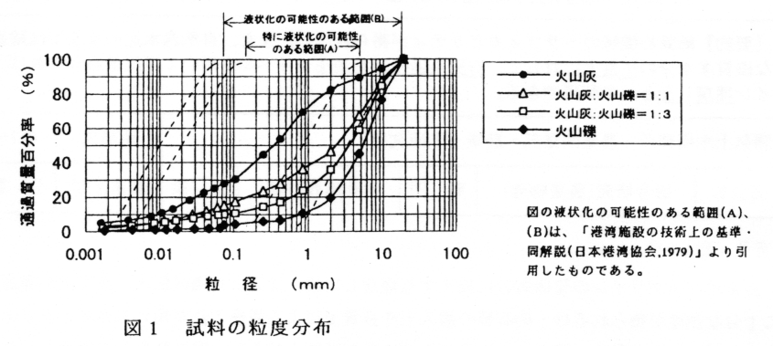現地の施工で発生する砂質火山灰土は、農業土木工事において資材として利用されているが、粒径組成によっては地震時に液状化現象を呈することがある。液状化に対する抵抗を向上させるのに、現地で発生する種々の粗粒火山灰土を混合して粒度改良するのが有効である。