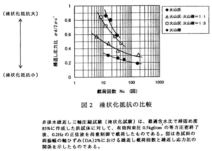 大型供試体(径200mm、高さ400mm)を用いて非排水繰返し三軸圧縮試験(液状化試験)をすれば、火山礫の混合割合の大きい試料ほど液状化抵抗が大きくなる(図2)。これは粒度改良の効果を示すものである。