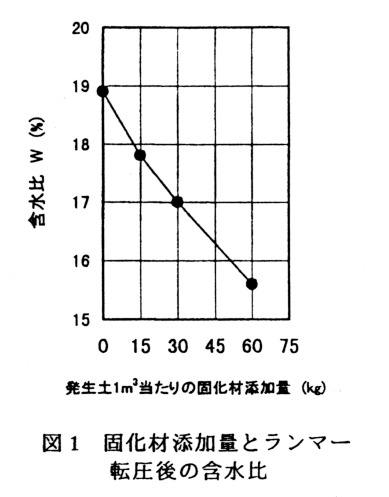 礫質で含水比の高い発生土(土質分類名:G-M,含水比19%)に石灰系固化材を混合すれば発生土の含水比が低下し、50kg級ランマーによる転圧が可能となる(図1)。