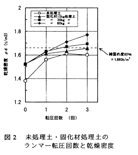 不良土1m3当たり30kgの固化材添加によりランマー転圧で、管体周辺の埋戻し土として標準的な締固め度である85%の締固め度を得ることができる(図2)。