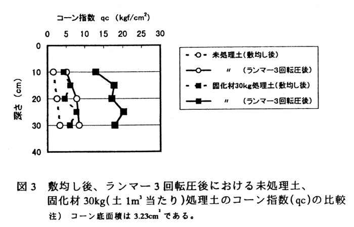 ランマー転圧後のコーン指数(qc)は、未処理土の場合に比べ増加し、ランマーによる転圧効果が明瞭に現れる(図3)。