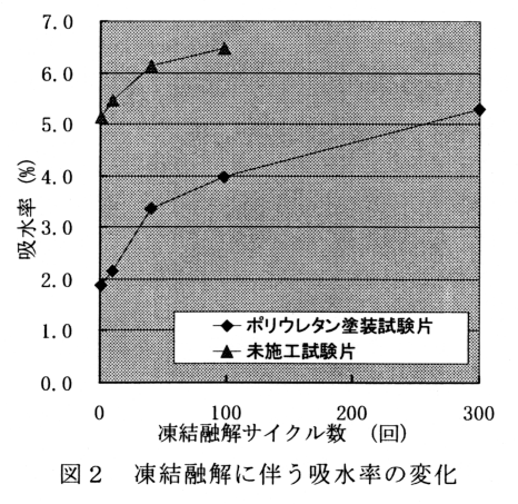 吸水率は両者とも凍結融解に伴い増加するが、ポリウレタン塗装コンクリートは300サイクル後でも未施工コンクリートの初期状態をわずかに上回った程度である。(図2)。