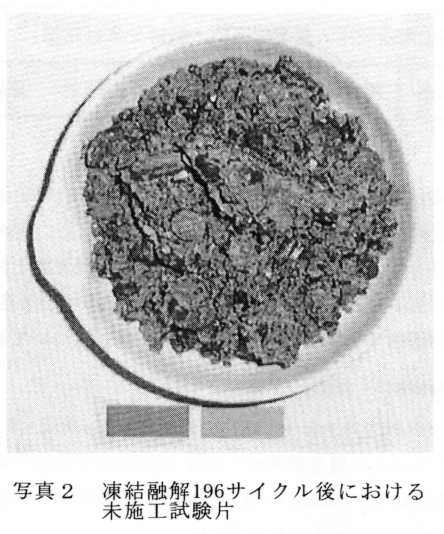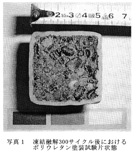 未施工コンクリートは凍結融解196サイクル後で完全に破壊するが(写真1)、ポリウレタン樹脂系塗料を塗装したコンクリートは300サイクルにおいても健全な形状を維持しており、塗装はコンクリートと十分密着している(写真2)。