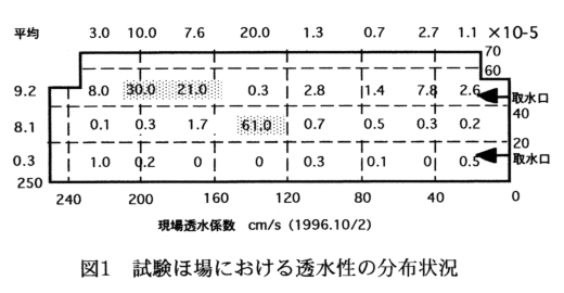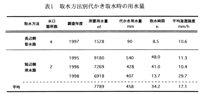 礫質褐色低地土のように浸透の多い大区画水田では、長辺沿いの多数の水口から取水すれば、通常の短辺方向からの取水に比べて取水量も取水時間も節減できる。