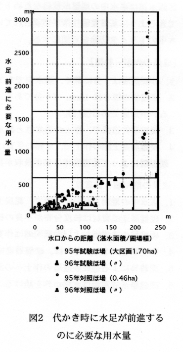下層士の透水性が大きい大区画圃場で短辺取水の場合、代かき時に水足が単位面積前進するのに必要な水量(一定時間内に水足が延びた面積でその時間内の用水量を割ったもの)は、水足の進行につれて激増する。(図2)