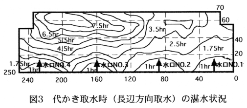 長辺の4ヶ所の水口から取水する場合、水足がおおむね順調に進行し、取水時間、代かき用水量がともに節減できる(図3)。年次によっては、短辺取水に比べ、用水量で80%、取水時間で75%減少した事例もある(表1)。