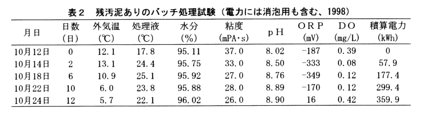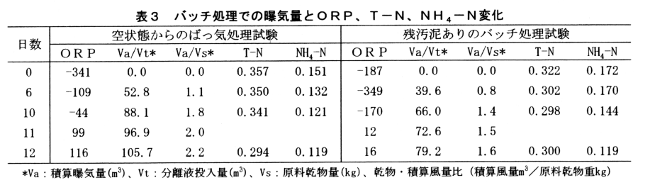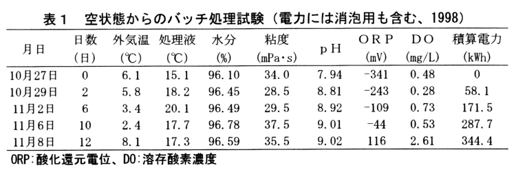 曝気槽を空にして固液分離液14.63m3(水分96.10%)を投入し、曝気量168m3/日でバッチ処理方式の曝気をすると、曝気開始から4日目から急激な発泡がみられ、7日目まで継続するが、食用油の投入により、消泡が可能である。処理液の温度は15℃から徐々に上昇し、6日目で20.1℃となり12日目は17.3℃程度となる。pHは2日目で8.81、10日目で9.01となり、ORPも11日目には+99mVとなる(表1、3)。