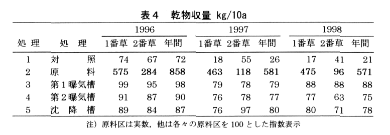 曝気処理によって、スラリー中のアンモニアが揮散するため、肥料成分が減少し、牧草の収量低下が認められる。また、スラリーに曝気処理をしても、施用窒素の吸収利用率等に影響はない(表4)。