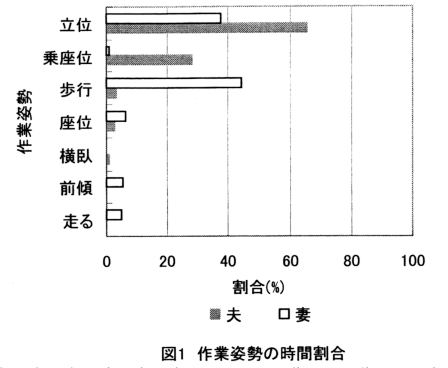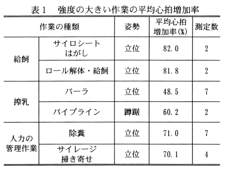 フリーストール方式での除糞や給餌作業は機械作業となり、主として夫が担当し立位や乗座位が多い。妻は主として搾乳作業を担当し立位が約9割を占める(図1)。機械作業のサイレージの切り出しや給餌、除糞などは乗座位が多く、心拍増加率は50%以下である。しかし、人力となる横断通路の除糞や、飼槽の掃き寄せ作業の心拍増加率は70%以上である(表1)。