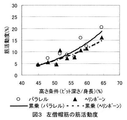 パラレルパーラではピットが深くなると左僧帽筋の筋負担が大きくなる。ヘリンボーンパーラではピット深さと左右の僧帽筋の筋負担に相関が認められる。搾乳作業の筋負担を軽減するための適正ピット深さは、左僧帽筋の筋活動度の最適範囲を8〜10%と設定すると、パラレルパーラでは身長の53〜56%、ヘリンボーンパーラでは身長の54〜58%と設定できる(図2、3)。