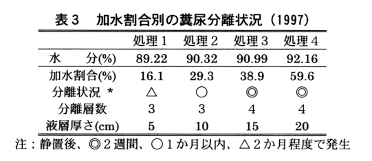 スラリーに対し10%加水撹拌区では分離の発生はみられない。16%の加水撹拌区では2ヶ月程度で液層の発生がみられるが、その量はきわめて少ない。30%の加水撹拌区では、静置後1〜2ヶ月で液分と固形分(沈殿と液上部の固形分)の3層に分離する。39%の加水撹拌区では静置後2週間程度で分離が開始し、2ヶ月後には4層に分離する。また、60%の加水撹拌区では、静置後数日から2週間で分離が始まり、2.5ヶ月で4〜5層に分離する(表2、3)。