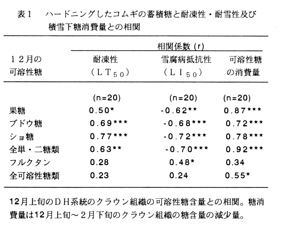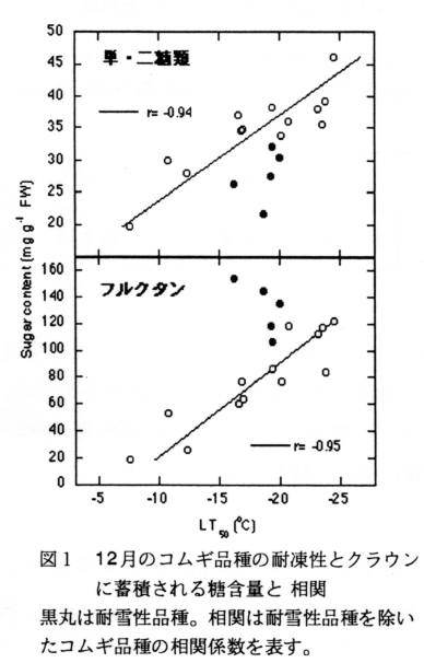 耐凍性・耐雪性に関する糖代謝とその分子制御機構の解明 予算区分 :特別研究(ハードニング) 研究期間 :平成10年度(平成7〜10年) 発表論文:M. Yoshida, J. Abe, M. Moriyama and T. Kuwabara, Carbohydrate levels among winter what cultivars varying in freezing toletance and snow mold resistance during autumn and wineter.Physiol. Plant. 103:8-16 (1998)