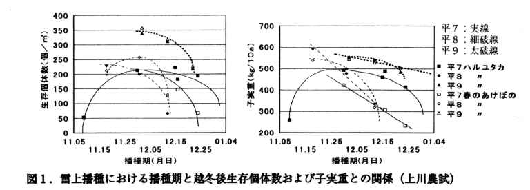 雪上播種は主に上川農試場内(褐色低地土)での成績である。なお、保水力に乏しい土壌では融雪後の乾燥で必要な個体数を確保できないため行なわない。