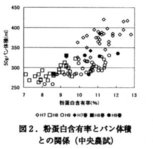 初冬播栽培では、窒素の後期施肥(止葉期〜出穂期)により蛋白含有量の向上とグルテンの質の強化が両立できる(図2)。