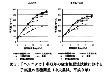 「春のあけぼの」の初冬播栽培は、成熟期の前進や多収の面で「ハルユタカ」と同様の効果が認められるが、春播栽培同様の品種間差が認められ、窒素施肥の蛋白向上に対する効果が鈍く、また「ハルユタカ」より収量が低い年次がある(図3)。