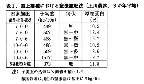 雪上播種での窒素施肥法は倒伏の軽減を考慮すると融雪直後にN7kg/10a、出穂期にN6kg/10aが適当である(表1)。