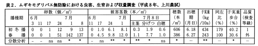 初冬播栽培(根雪前播種および雪上播種、以下同様)では、生育ステージの前進化によりムギキモグリバエによる主茎の被害が少ないため減収は認められず、ムギキモグリバエの防除は不要である(表2)。