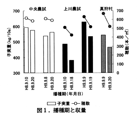 播種期は、各地の秋期の気象をもとに小麦地帯別栽培指針(平成2年度)を参考にする。