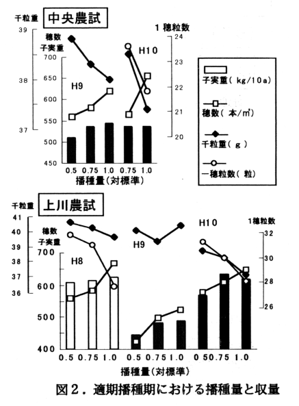 播種量については、0.5倍量は標準播種量(340粒/m2)に比べて減収した結果もみられるが、播種量0.75倍量の収量はほぼ同等で(図2)、倒伏の発生を軽減することを考えあわせ、「チホクコムギ」同様、標準の0.75倍量(255粒/m2)が適当である。