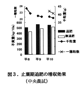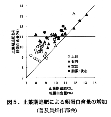 止葉期の窒素追肥(3kg/10a)により約1%の粗蛋白含量が増加するため、通常年で粗蛋白含量が10%以上となるほ場では、止葉期の追肥は行わない。