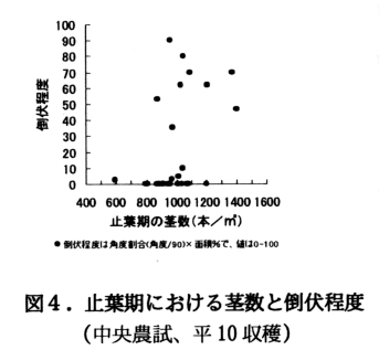 止葉期の茎数が800〜900本/m2以上では、倒伏の発生が助長されることがある(図4)。