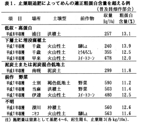 当該地域では止葉期追肥によりめんの適正粗蛋白含量(10〜11%)に近づき「チホクコムギ」の施肥技術を適用できるほ場が多いが、空知、胆振、後志の一部では適正値を超え(図5)、前作が野菜の場合や、泥炭土などでは、止葉期追肥によりめんの適正粗蛋白含量を越える試験例がみられる(表1)。