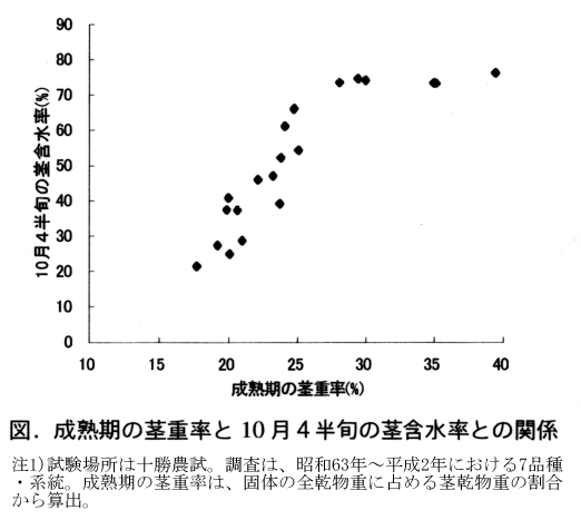 茎水分は、成熟期の75%前後から序々に低下し、着莢障害が発生した年を除き11月上旬にはほぼ20〜30%に低下する。品種・年次間差の最も大きかった10月4半旬の茎含水率は、成熟期の茎重率と関係が深かい(図)。