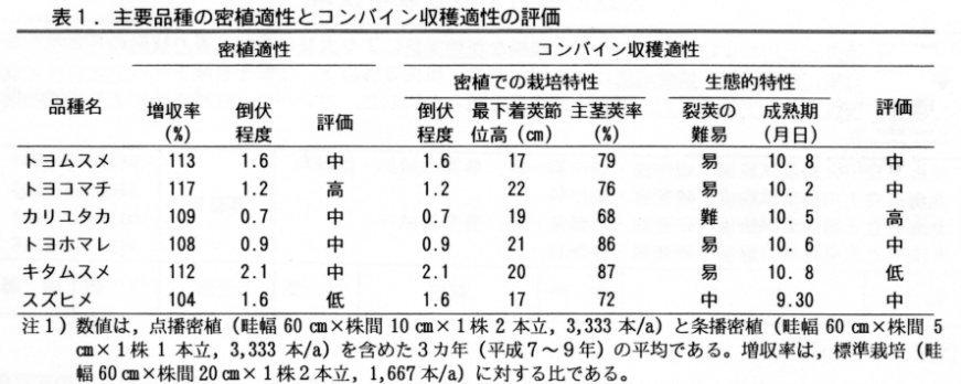 主要6品種中、密植適性では増収率が高く倒伏も比較的少ない「トヨコマチ」が、密植でのコンバイン収穫適性では耐倒伏性の強い難裂莢性品種「カリユタカ」が高い(表1)。