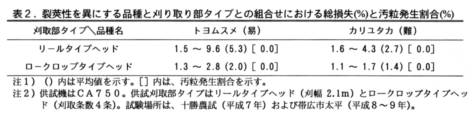 裂莢性難の「カリユタカ」ではリールおよびロークロップ・タイプヘッドのどちらも総損失はそれぞれ2.7%と1.4%で少いが、裂莢性易の「トヨムスメ」ではリールタイプで総損失5.3%、ロークロップ・タイプで2.0%である(表2)。よって、裂莢性易の品種のコンバイン収穫では、ロークロップ・タイプヘッドの利用が望ましい。