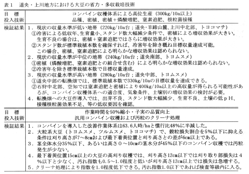 道央・上川:高位生産の実証試験成績は同地方の気象・土壌条件の類似する地帯の大豆栽培に適用する。コンバイン収穫試験成績は収穫時の茎水分が高く、汚粒の発生しやすい地域に適用する。汚粒クリーナ試験成績は大粒系で子実水分18〜20%の成果であるため、小粒大豆や低水分大豆では処理状態に留意する。