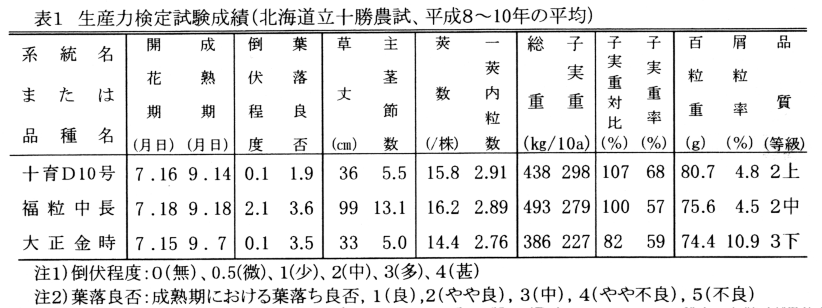 「十育D10号」は「福粒中長」に比べ成熟期は4日程度早く、7%多収である。