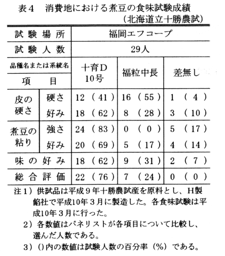 煮豆に加工した食味試験では、煮豆の粘りが強く、味、総合評価では好まれる傾向であった。