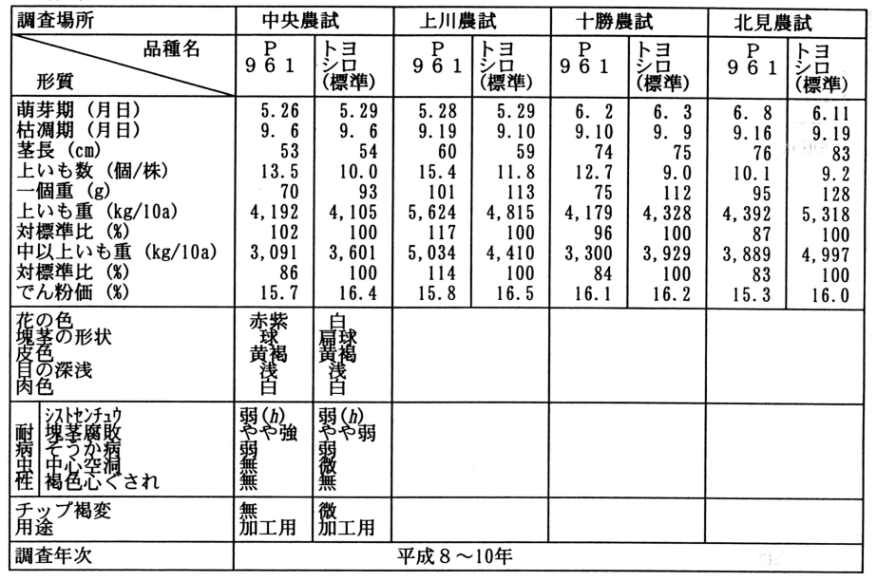 「P961」は、中早生に属する加工食品用(ポテトチップ)である。「トヨシロ」に比べ6℃で貯蔵した場合の還元糖の増加が少なく長期貯蔵後のポテトチップ加工適性が高い。