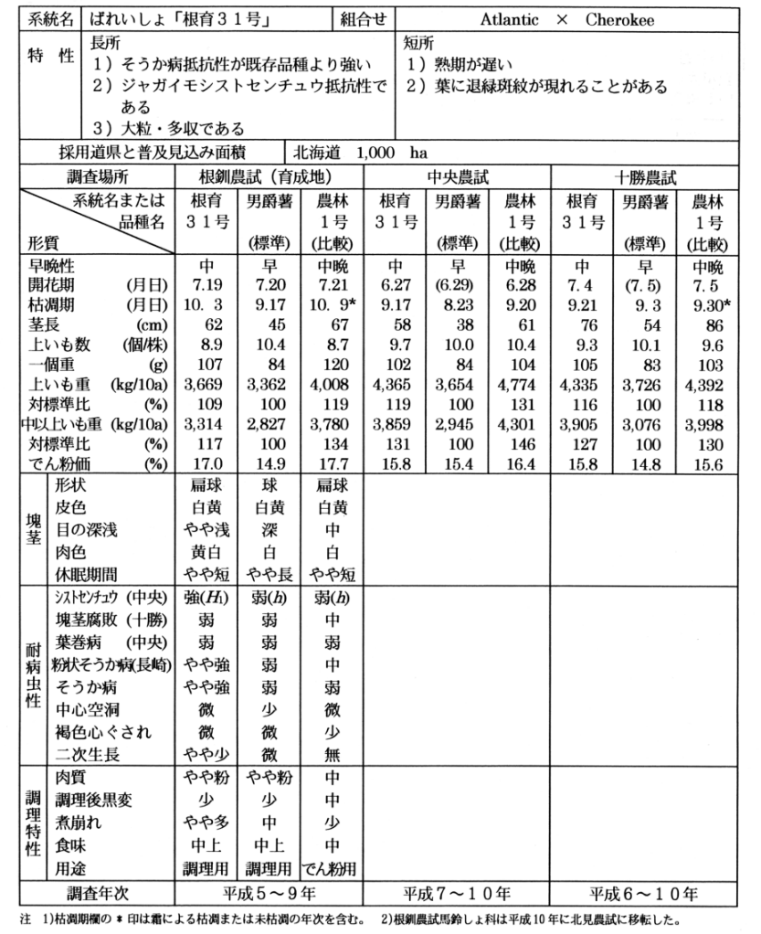 「根育31号」は、中生に属する調理用のばれいしょである。「男爵薯」より上いも平均一個重が大きく、上いも重及び中以上いも重が多い。そうか病抵抗性はや上いも平均一個重が大きく、上いも重及び中以上いも重が多い。そうか病抵抗性はや