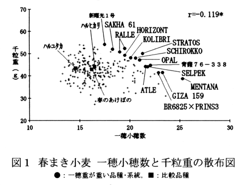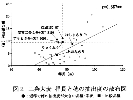 麦類の交配母本材料選定の参考とするため、穂の収穫構成要素と関係する形質が顕著な値を示した品種・系統を抜粋している(図1。また、大麦では短稈で穂の抽出度が大きい品種・系統のあることを明らかにしている(図2)。