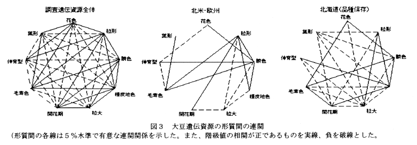 大豆の各形質の関連性を明らかにするために、カイ2乗検定を行ったところ、原産地毎に連関の認められた形質が異なっており、原産地における利用形態や育種目標によって形質の特性に偏りのあることが認められる。(図3)。