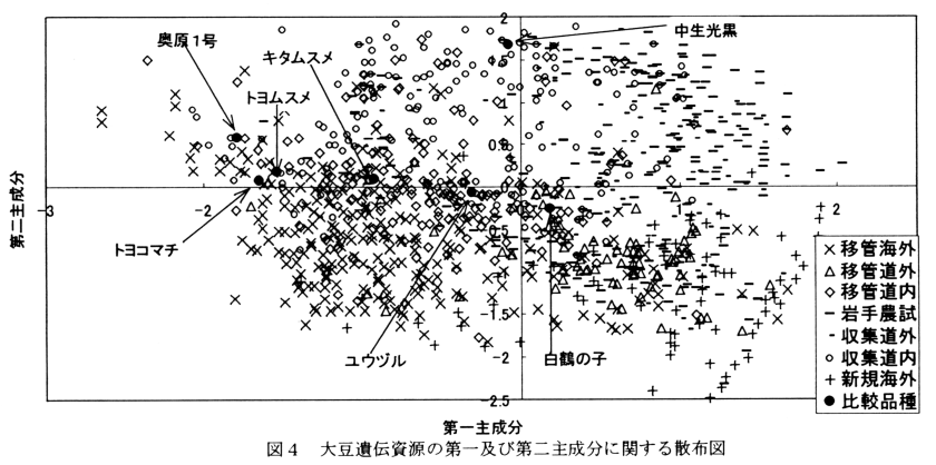 さらに、大豆の主な形質について主成分分析を用い遺伝資源の分類を試みたところ、原産地及び導入先によって分布が異なり、大まかな分類が可能である(図4)。