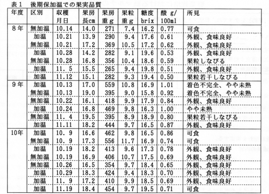 成熟期に入った10月上旬から加温を行い、ハウス内最低気温を5℃に維持すれば、11月上中旬まで収穫時期を延長できる(表1)。