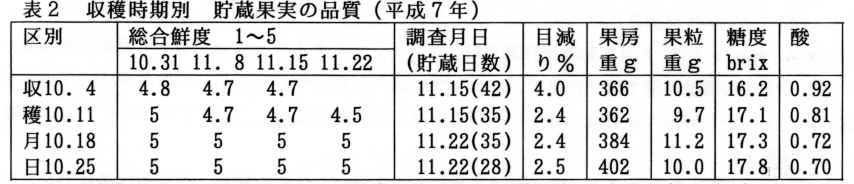 欧州種ぶどう「ルビーオクヤマ」は、無加温ハウス栽培で10月上中旬に成熟するが、樹上にそのまま維持すると10月下旬まで収穫可能である(表1)。