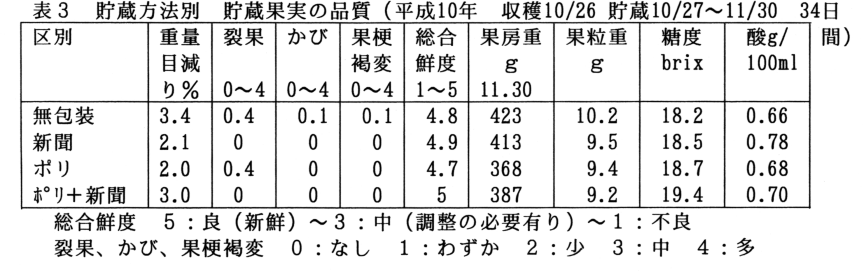 無加温で栽培した「ルビーオクヤマ」の果実を1℃で冷蔵すると、約5週間新鮮な状態を維持できる(表2、表3)。